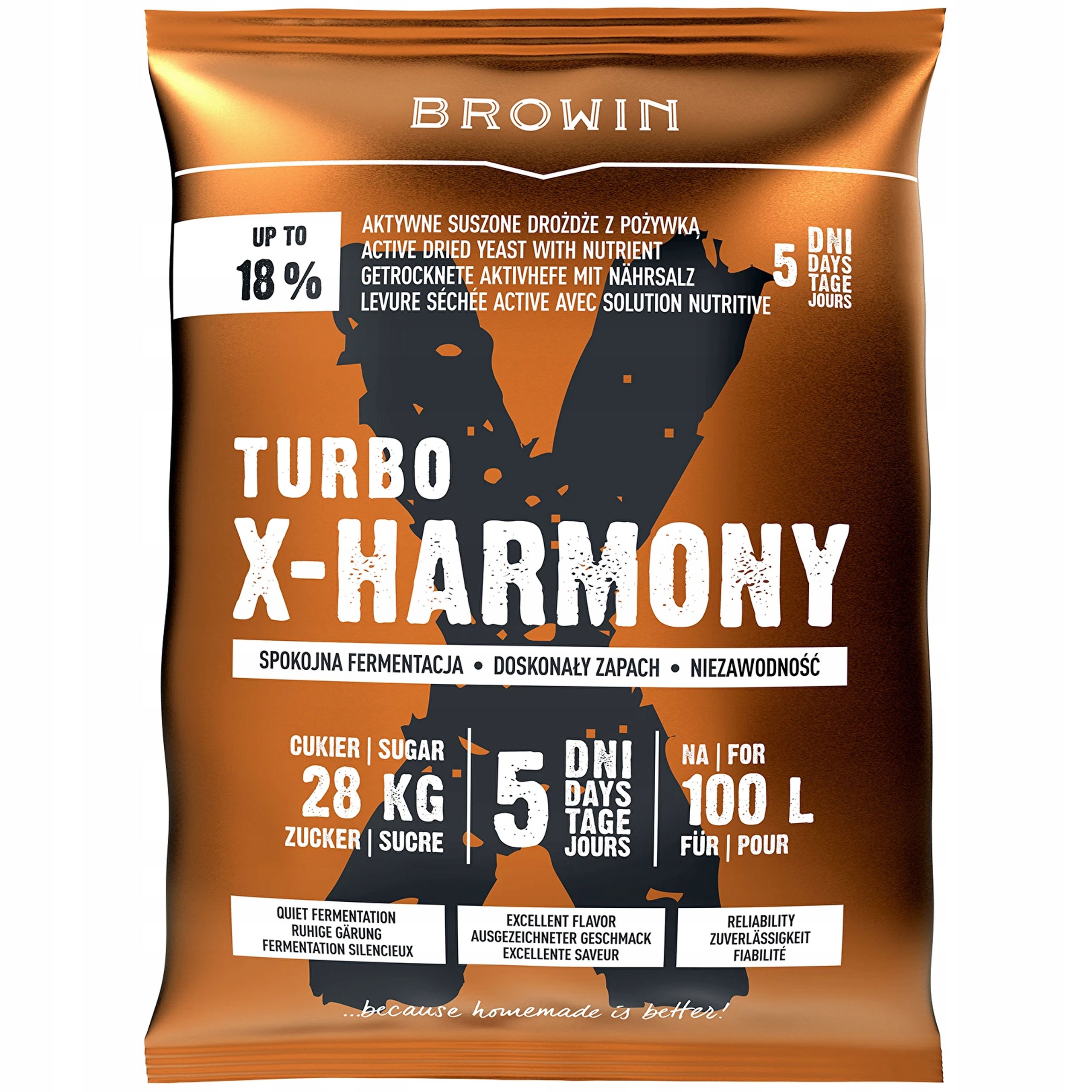 Drożdże Turbo X-Harmony znacznie wyróżniają się w swojej kategorii. Używając ich, zapomnisz o nieprzyjemnych zapachach często kojarzonych z domową fermentacją. Twój nastaw nie tylko zachowa piękną klarowność, ale także każdy element procesu przebiegnie w sposób kontrolowany. Produkty końcowe uzyskane z Turbo X-Harmony cieszą się świetnymi opiniami zarówno w kwestii zapachu, jak i smaku. Nawet najbardziej wymagający użytkownicy docenią różnicę, którą wprowadza technologia użyta przy produkcji tych drożdży.
