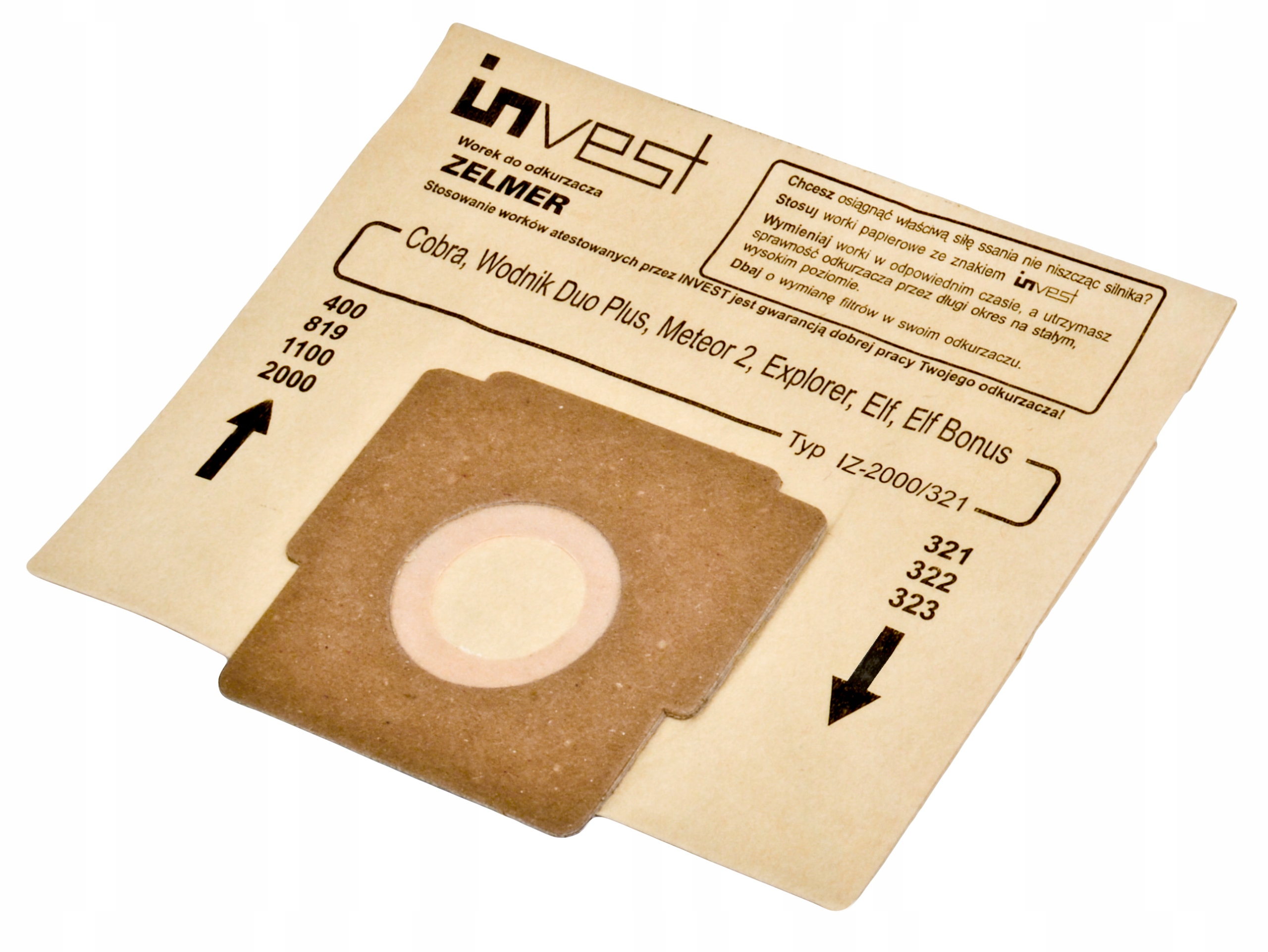 Worki papierowe do odkurzaczy typ 321, 322, 323 Należy je używać i wymieniać zgodnie z instrukcją odkurzacza.
