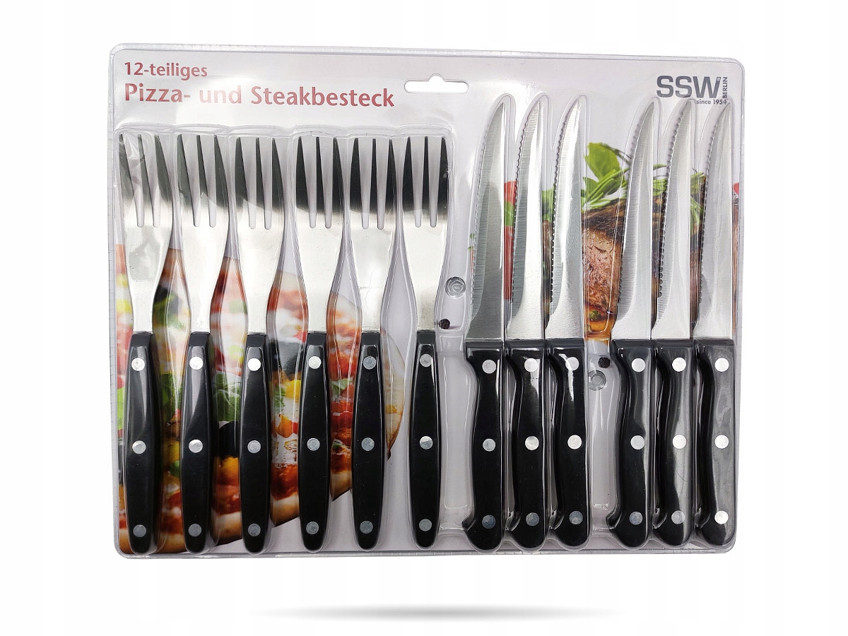 Zestaw sztućców do steków i pizzy to połączenie pięknego wyglądu, funkcjonalności i niemieckiej precyzji marki SSW. Ostrza wykonane z wysokiej jakości stali nierdzewnej są nie tylko trwałe, ale również świetnie radzą sobie z krojeniem steków czy pizzy. Uchwyty z tworzywa sztucznego są ergonomiczne, a dodatkowe nitowanie zwiększa ich stabilność i bezpieczeństwo. Dzięki uniwersalnemu designowi i klasycznemu stalowemu kolorowi produkt doskonale komponuje się z każdą dekoracją stołu. Ten zestaw nie tylko ułatwi przygotowanie posiłków, ale także sprawdzi się podczas domowych przyjęć.