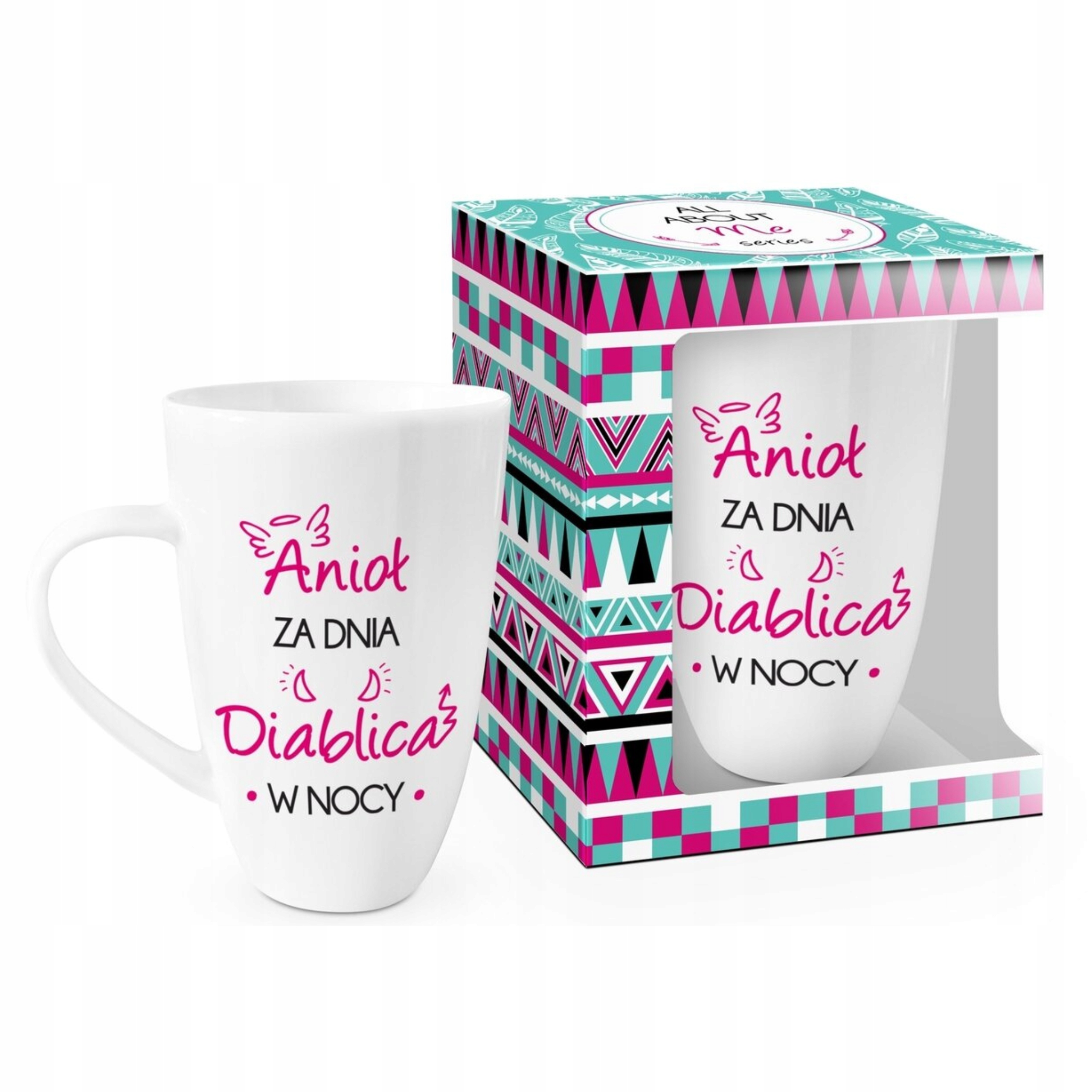 ⬜⬛ Kubek zapakowany w ozdobne pudełko dekorowane futurystycznymi wzorami i napisem: