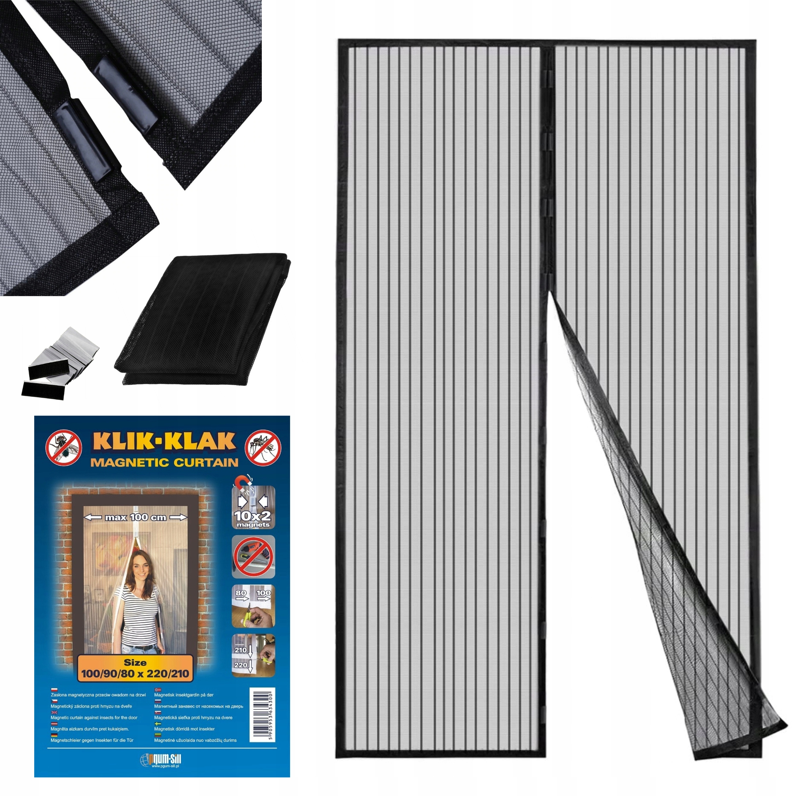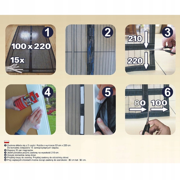 Wysokiej jakości siatka z magnesami do zabezpieczenia domu przed wszelkimi owadami - komarami, muchami, pszczołami, ćmami. Świetnie sprawdza się również jeśli masz kota lub psa, bo umożliwia zwierzakom swobodne wychodzenie na zewnątrz. Instalacja moskitiery jest wyjątkowo prosta – nie potrzeba do tego żadnych gwoździ, śrub czy narzędzi, wystarczą rzepy które są w zestawie.