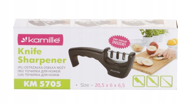Trzystopniowa ostrzałka do noży Kamille jest niezwykle praktyczna i przydatna w każdej kuchni. Ostrzałka wykonana jest z wytrzymałego i lekkiego materiału z podstawą antypoślizgową i ergonomicznym uchwytem, co pozwoli na pewne trzymanie jej w ręce i skuteczne ostrzenie noży.