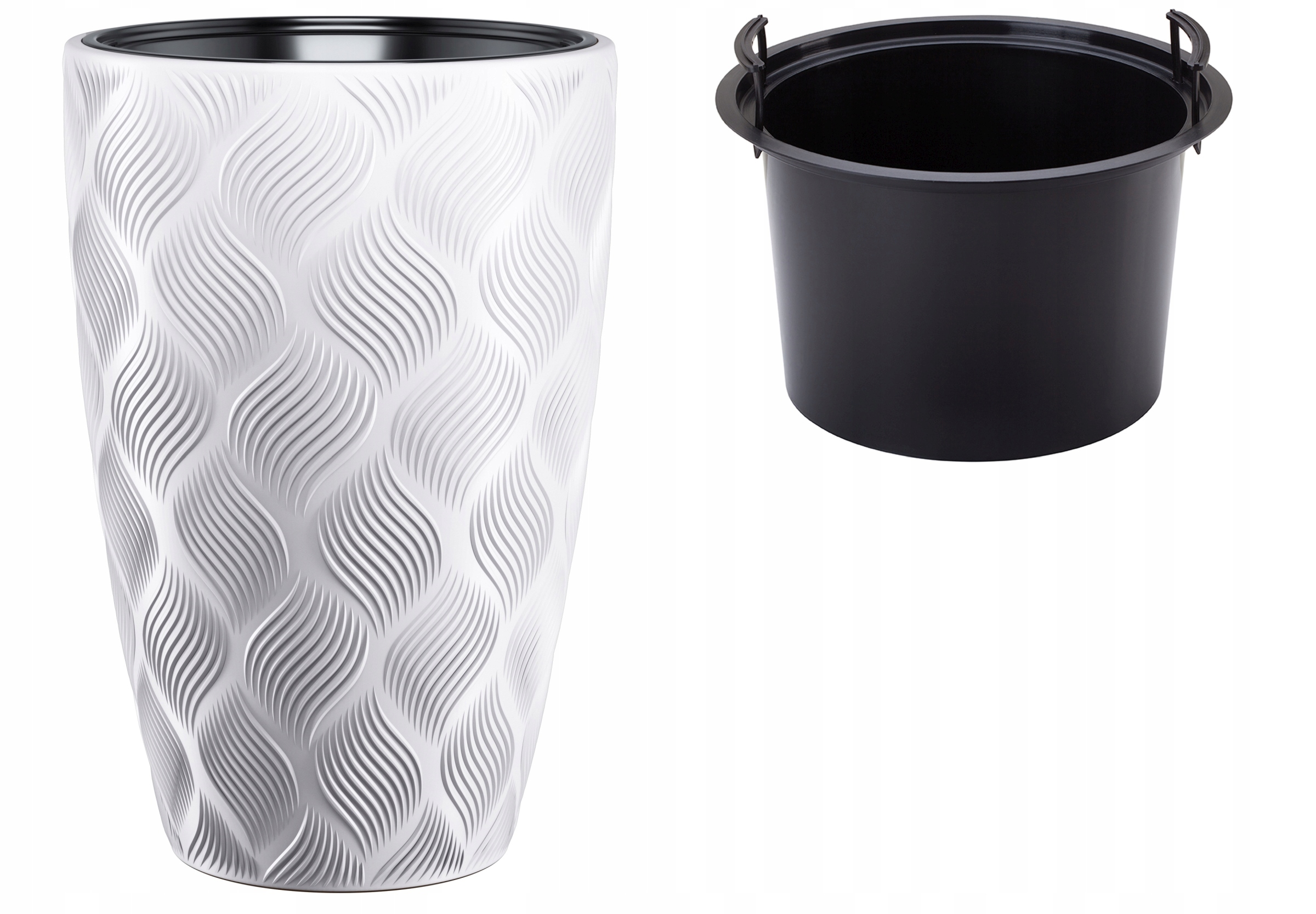 FLOW Slim to połączenie nowoczesnego wzornictwa i funkcjonalności. Jej ryflowana powierzchnia 3D przyciąga wzrok i dodaje charakteru każdemu miejscu, w którym się znajduje. Plastik, z którego jest wykonana, jest nie tylko estetyczny, ale też trwały i odporny na zarysowania. Wkład z uchwytami ułatwia codzienną pielęgnację roślin, co czyni tę doniczkę praktyczną i wygodną w użyciu. Jej klasyczny biały kolor pasuje do niemal każdej aranżacji, a odporność na warunki atmosferyczne umożliwia wszechstronne zastosowanie.