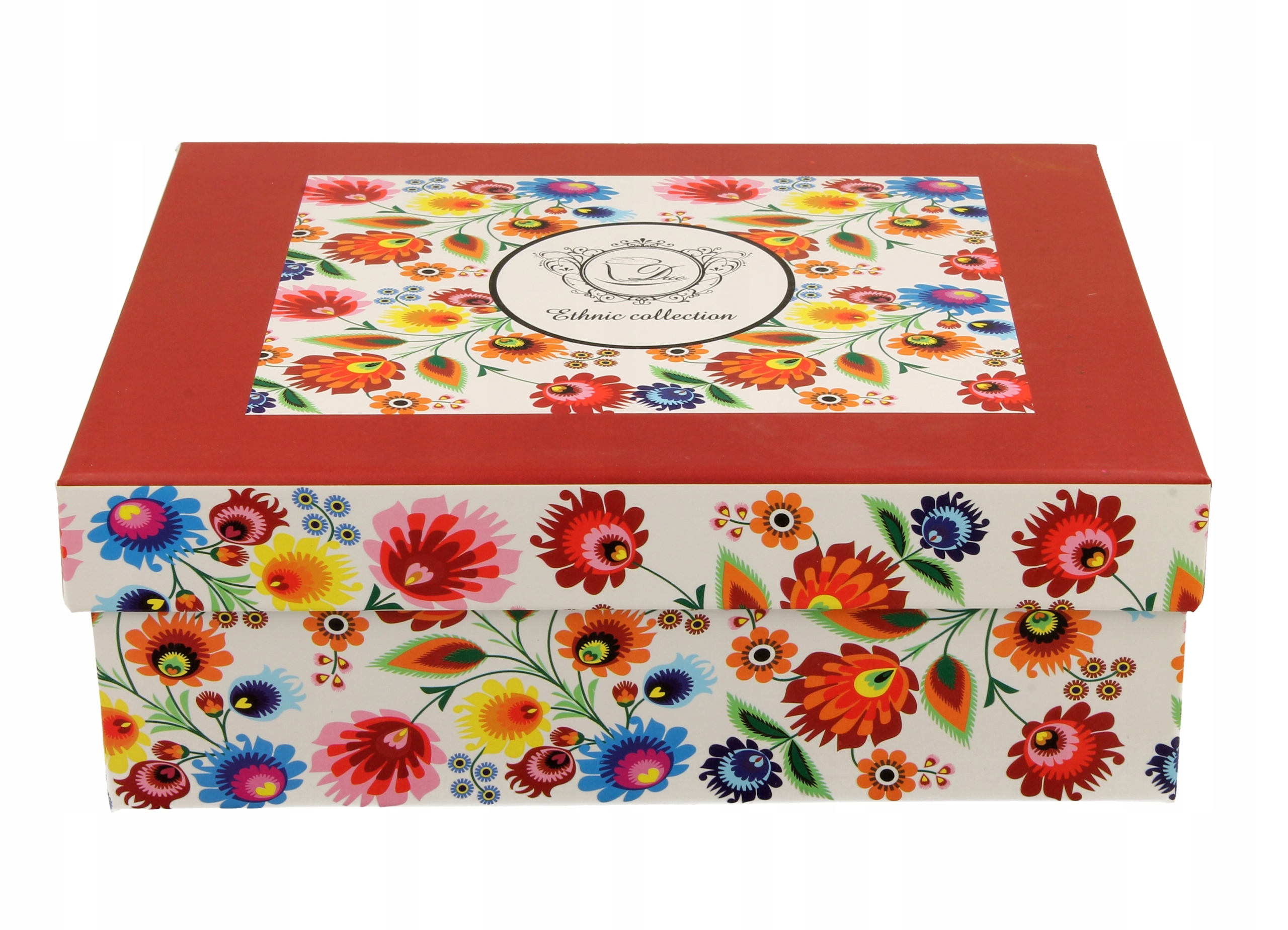 Linia charakteryzuje się wyrazistym, kolorowym motywem tradycyjnych regionalnych wycinanek w kształcie pawich oczek na białym tle.