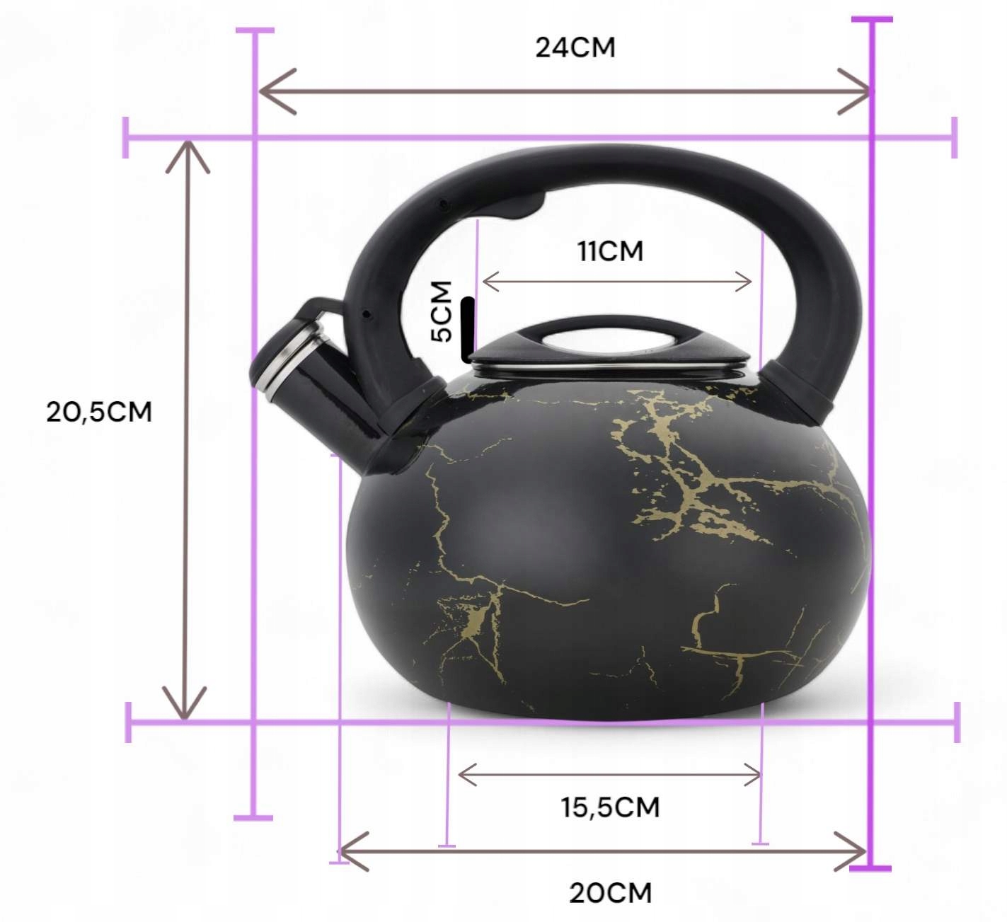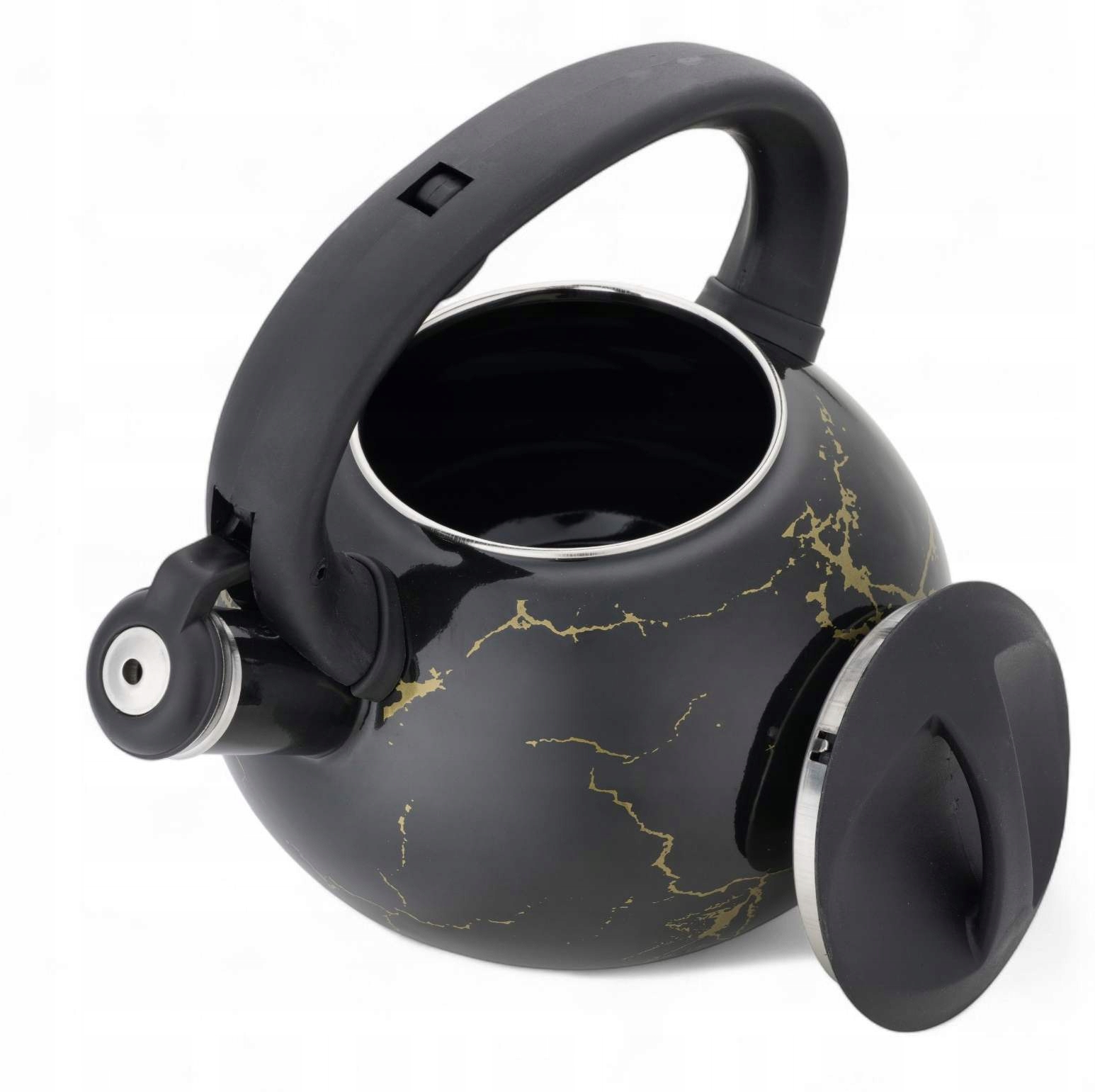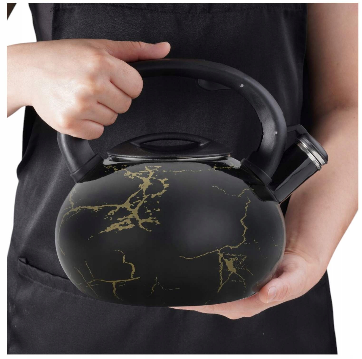- Czajnik emaliowany z gwizdkiem w eleganckim, czarnym wykończeniu to stylowy dodatek do każdej kuchni.