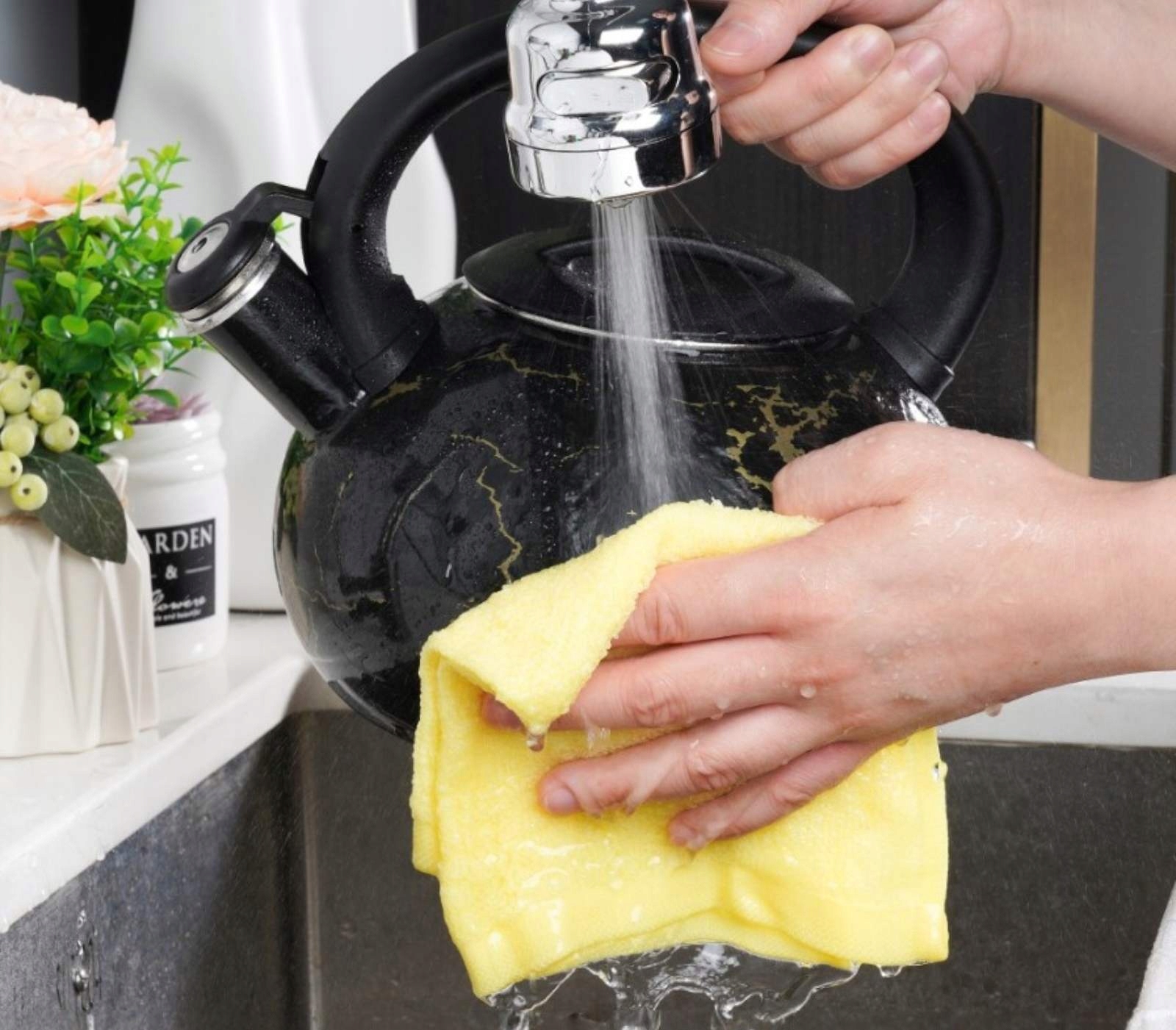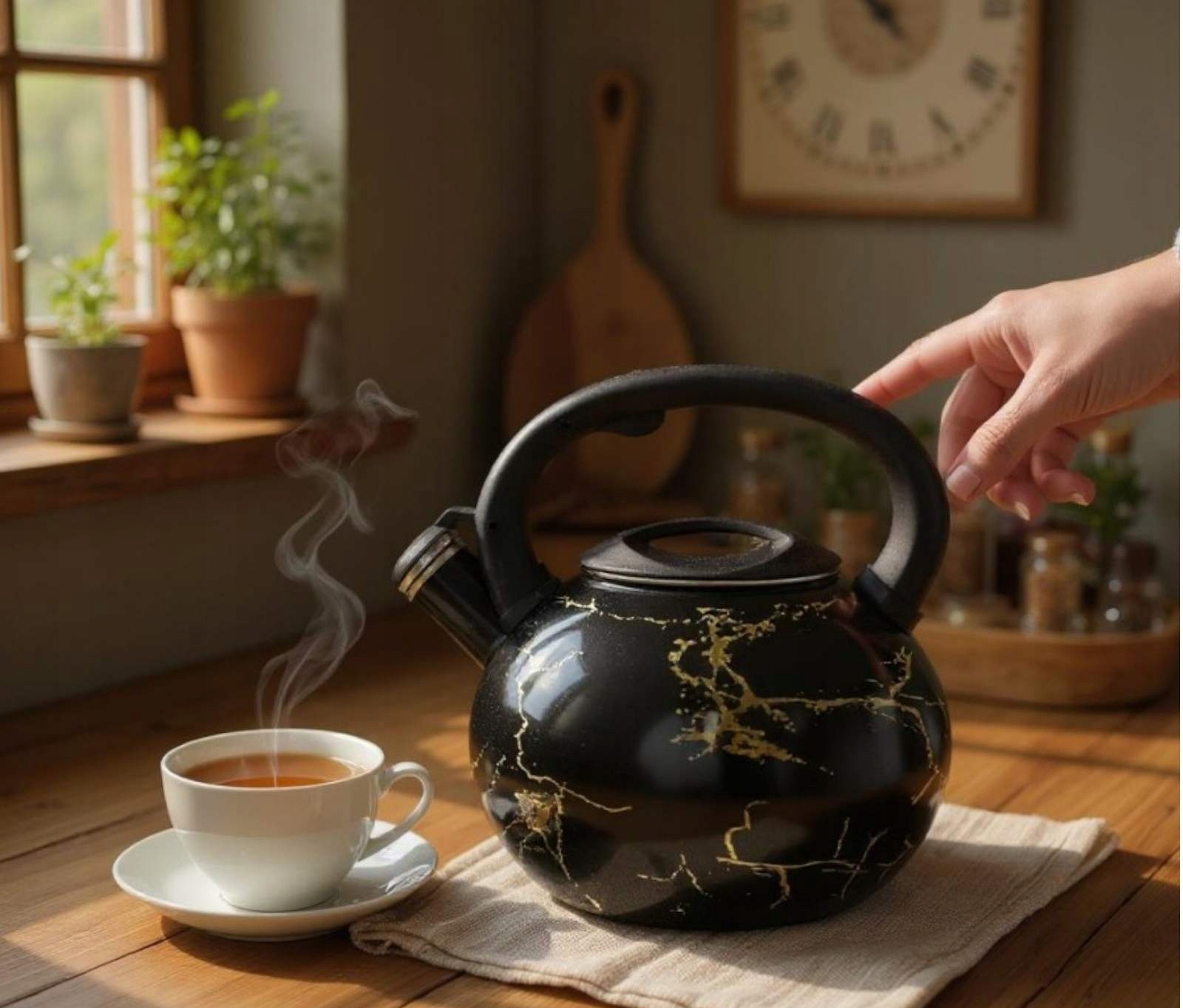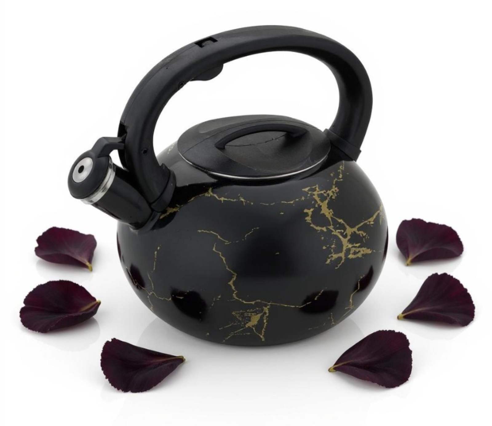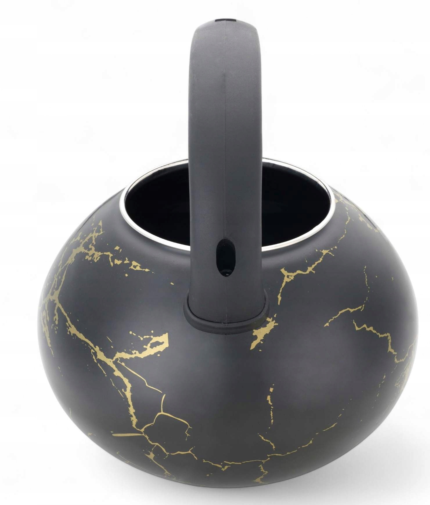 - Czajnik emaliowany z gwizdkiem w eleganckim, czarnym wykończeniu to stylowy dodatek do każdej kuchni.
