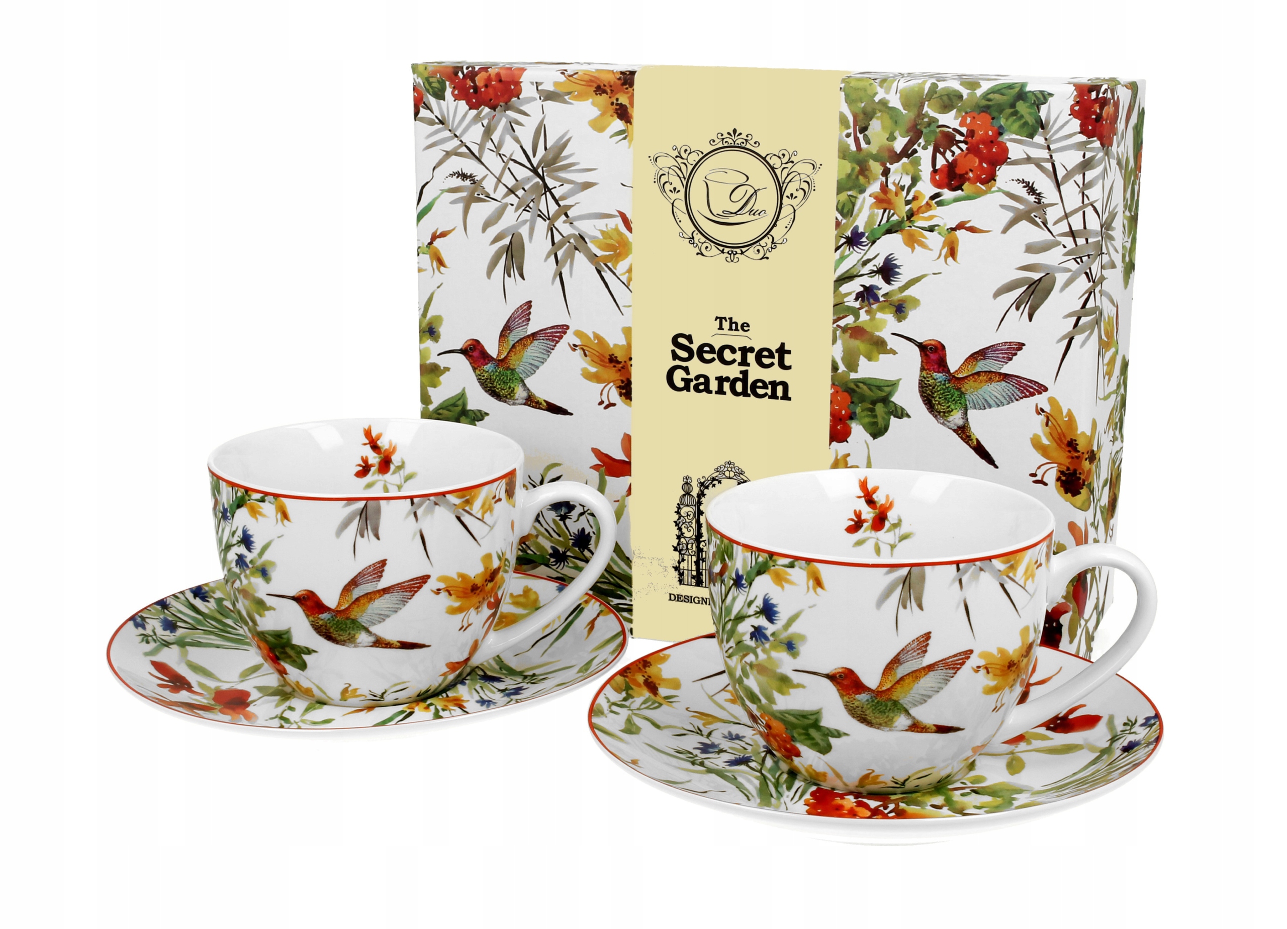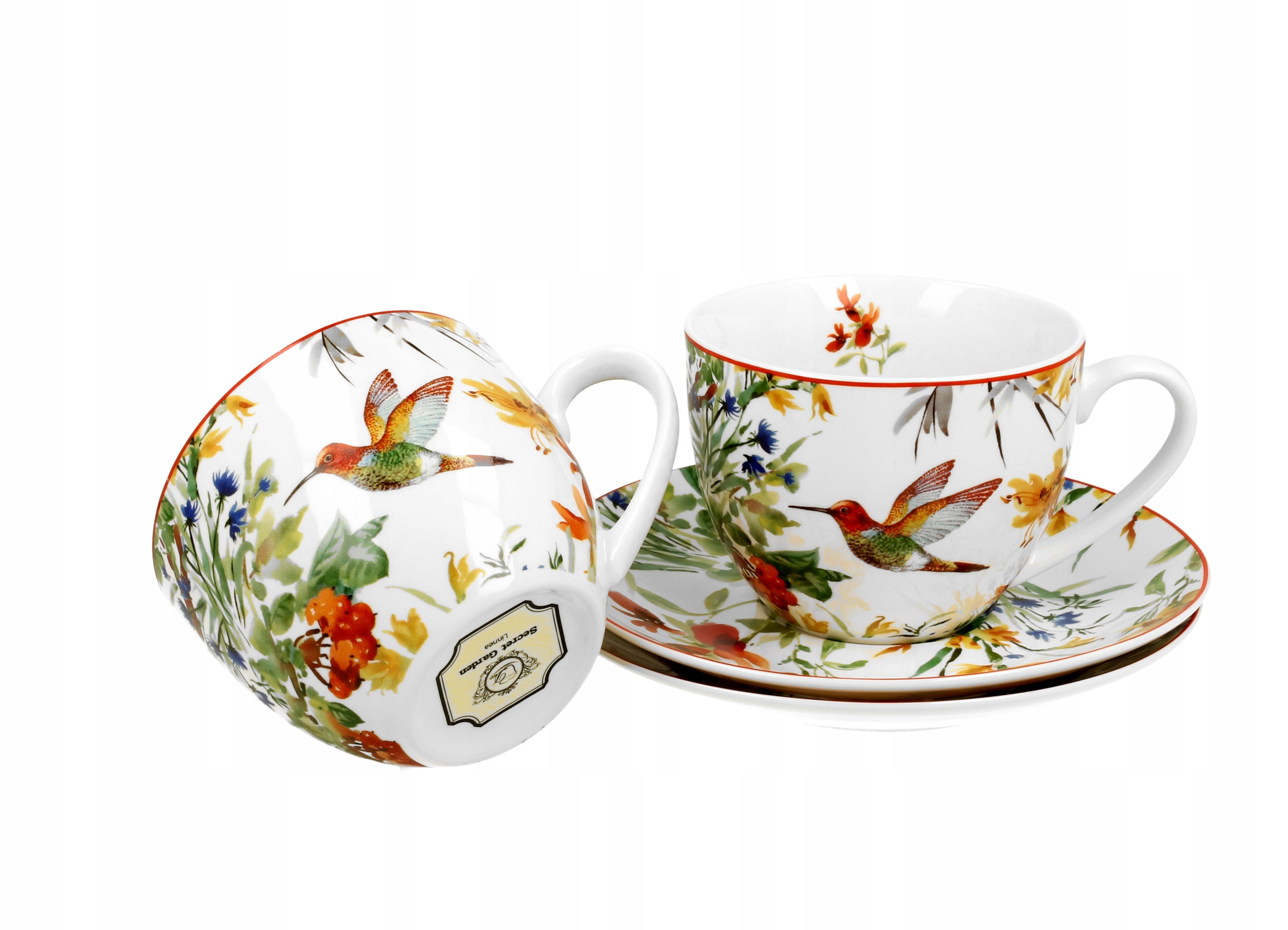 Komplet 2 filiżanek 280 ml ze spodkami LINNEA wchodząca w skład serii Secret Garden, wykonany z porcelany New Bone China, która charakteryzuje się naturalnym kremowo-białym kolorem z delikatnym połyskiem oraz wyjątkową wytrzymałością i trwałością, zachowując lekkość i finezję. Linia zdobiona motywem malowanych kwiatów w wyrazistych kolorach oraz uroczego kolibra.