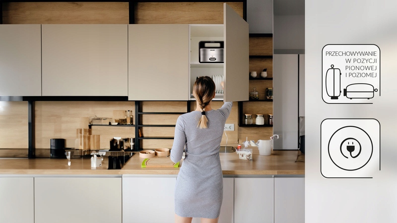 Mała powierzchnia użytkowa w kuchni to żaden problem. Opiekacz do kanapek MOP-48M został zaprojektowany z myślą o oszczędności przestrzeni. Urządzenie możesz przechowywać w pozycji poziomej i pionowej, co oznacza, że zmieści się nawet w niewielkiej szafce czy szufladzie kuchennej. Specjalne miejsce na nawinięcie przewodu sieciowego znajdujące się na spodzie urządzenia pomoże Ci dodatkowo zachować porządek w kuchni.