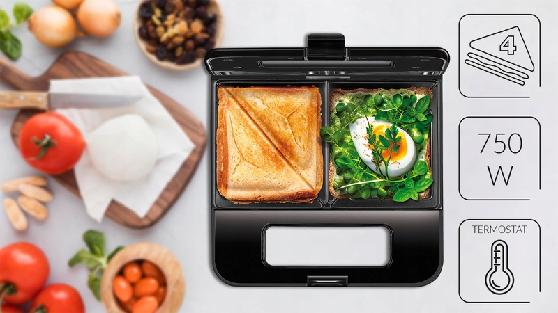 Marzysz o idealnie wypieczonych kanapkach z chrupiącą skórką, pod którą skrywają się Twoje ulubione smaki? Poznaj opiekacz do kanapek MOP-48M, w którym jednocześnie przygotujesz cztery trójkątne kanapki i ciesz się smakiem ulubionych wypieków w zupełnie nowy wydaniu. Pyszne kanapki możesz przygotować zarówno na słodko, jak i w wersji wytrawnej.