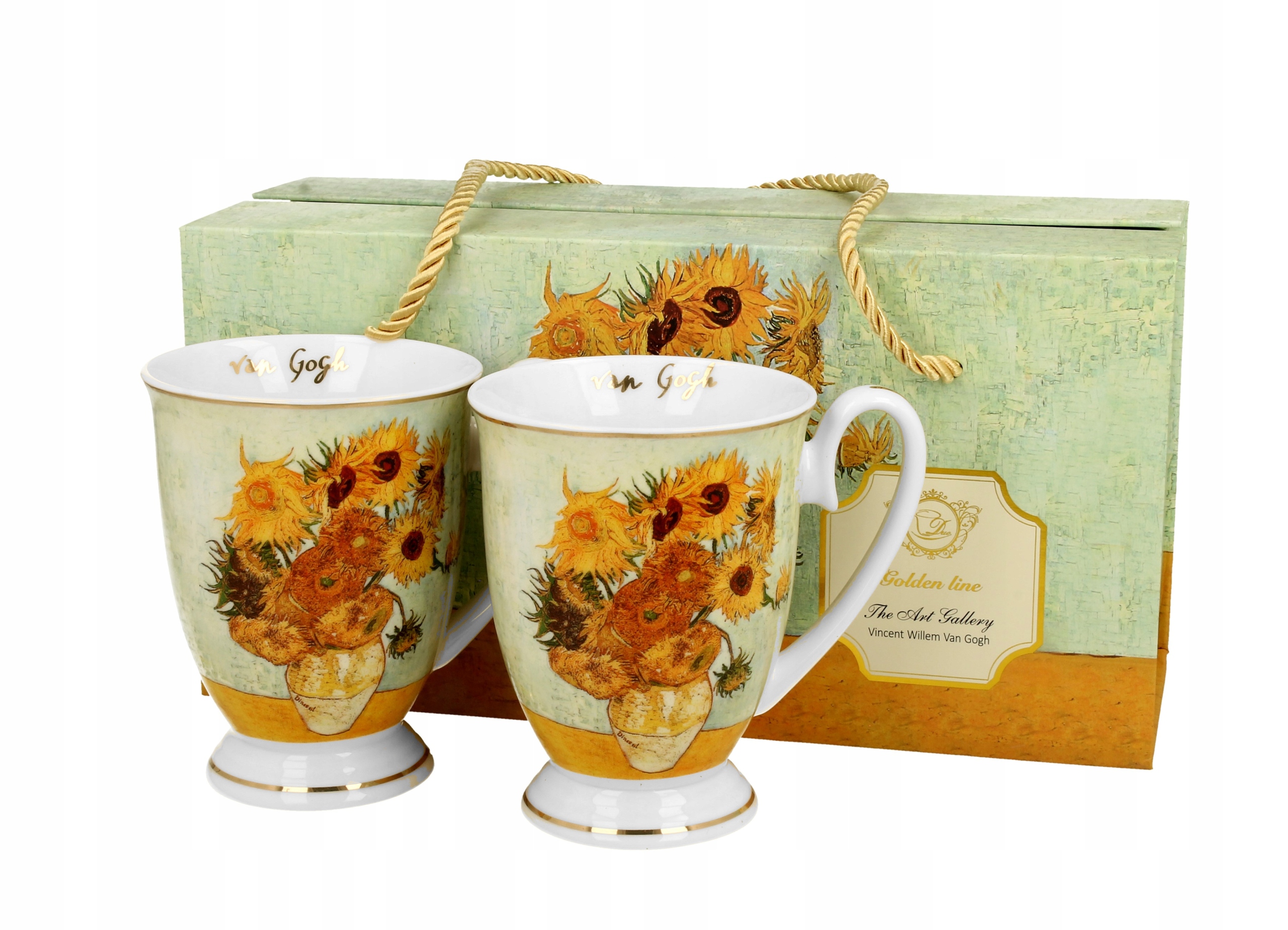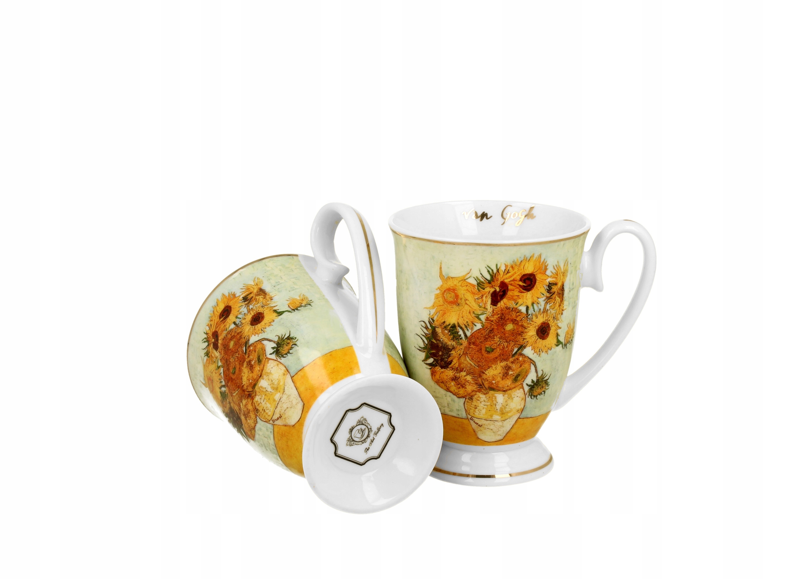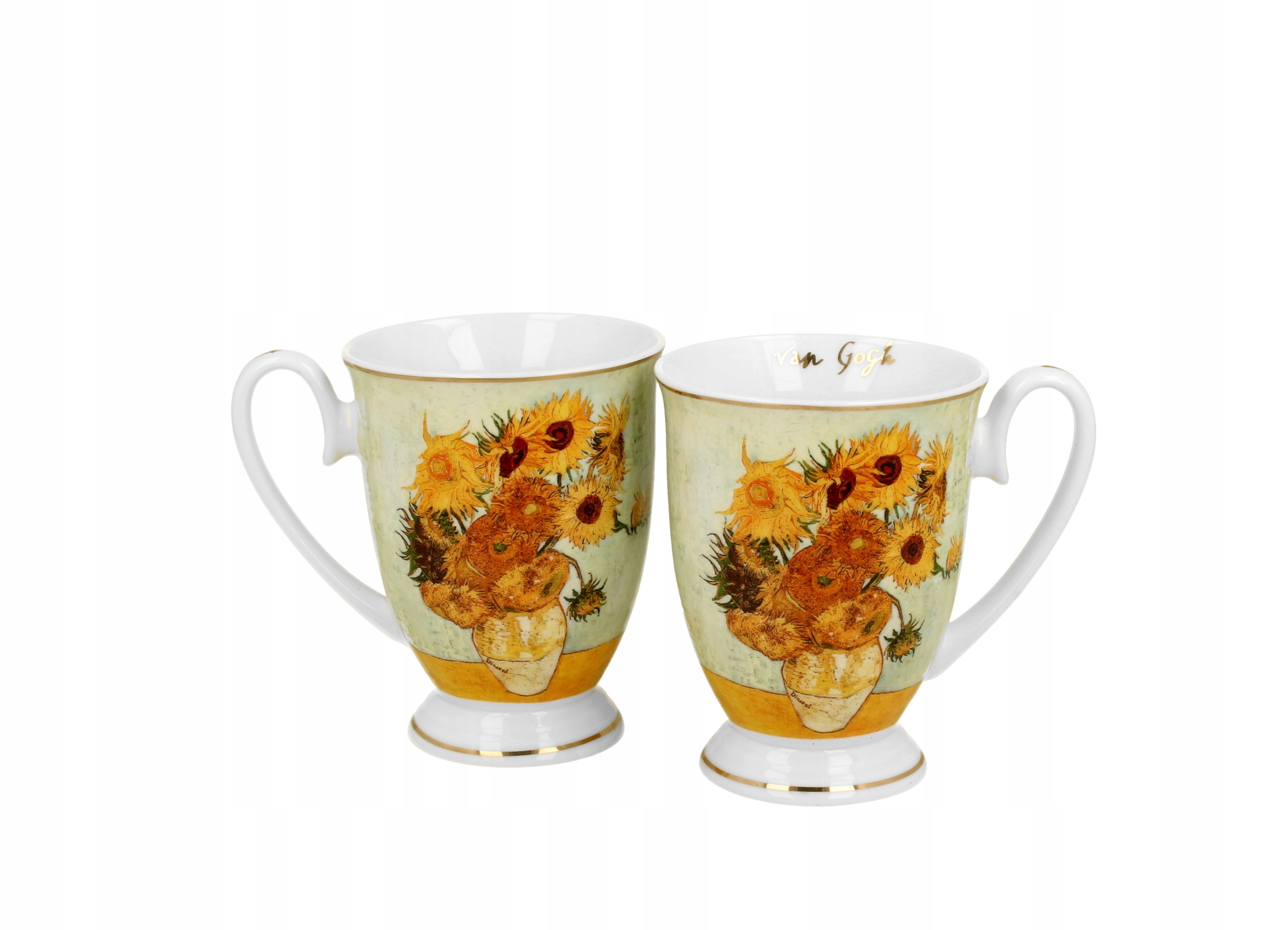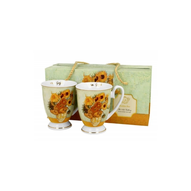 Komplet dwóch kubków royal SUNFLOWERS inspired by Van Gogh wchodzący w skład serii Golden Line, wykonany z porcelany New Bone China, która charakteryzuje się naturalnym kremowo-białym kolorem z delikatnym połyskiem oraz wyjątkową wytrzymałością i trwałością, zachowując lekkość i finezję.