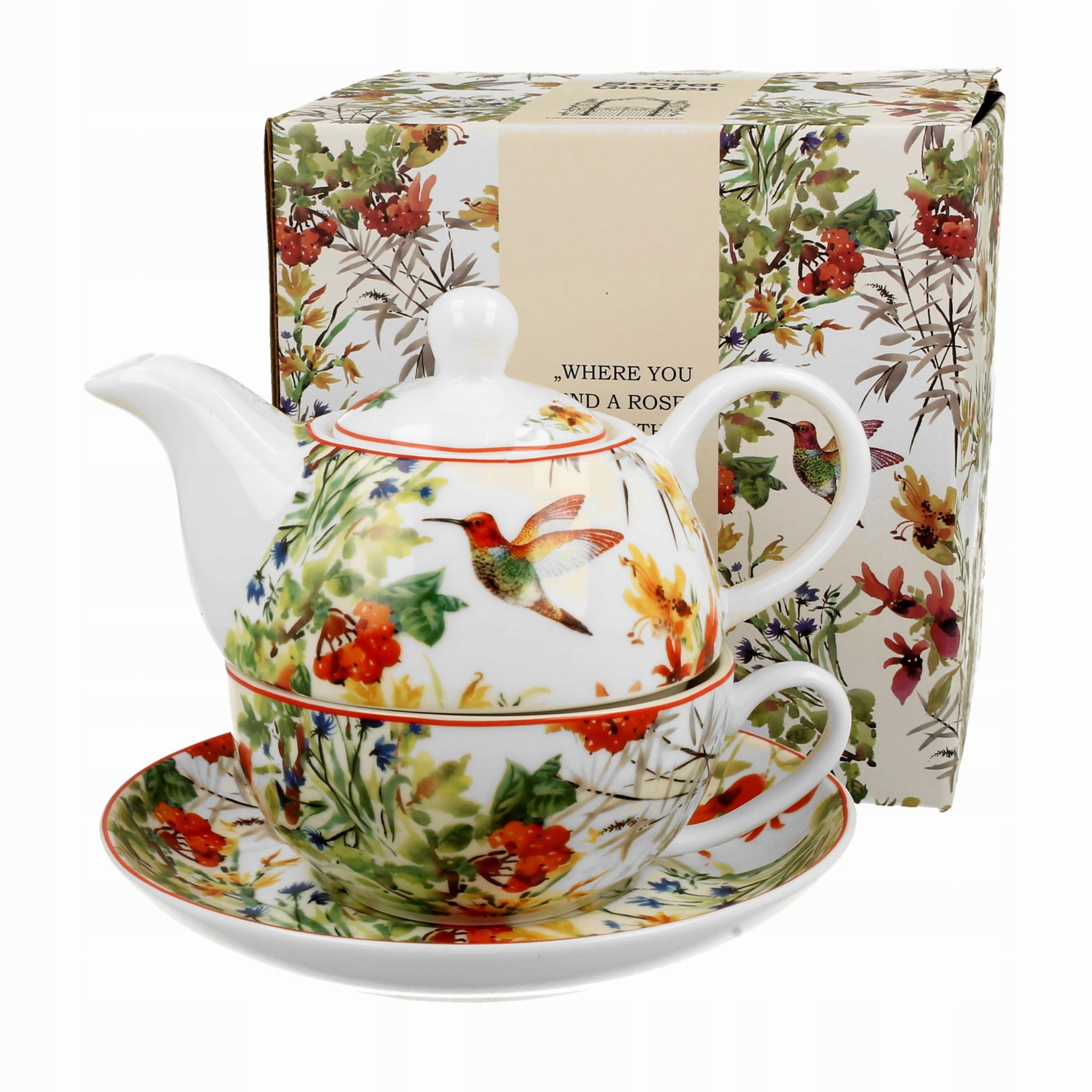 Ten elegancki zestaw filiżanki z dzbankiem łączy w sobie wyrafinowany design i trwałość materiałów. Wykonany z najwyższej jakości porcelany New Bone China, zachwyca naturalnym kremowym odcieniem i subtelnym połyskiem. Piękny ręcznie malowany wzór inspirowany motywem ogrodu - kolorowe kwiaty oraz uroczy koliber - dodają całości wyjątkowego charakteru. Zestaw ten nie tylko prezentuje się wyjątkowo, ale jest także niezwykle funkcjonalny. Niezależnie od okazji, idealnie sprawdzi się w codziennym użytkowaniu.