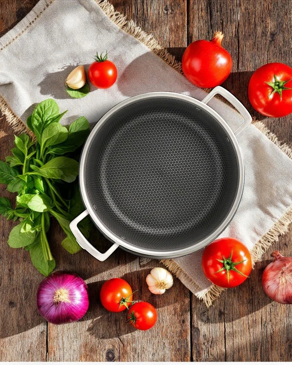 - Dwuwarstwowa powłoka nieprzywierająca i struktura plastra miodu ułatwiają czyszczenie i zapewniają równomierne gotowanie.