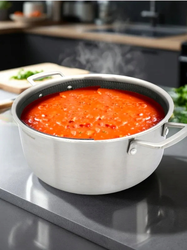 - Ergonomiczny uchwyt wykonany ze stali nierdzewnej zapewnia stabilność i komfort podczas przenoszenia gorącego naczynia.
