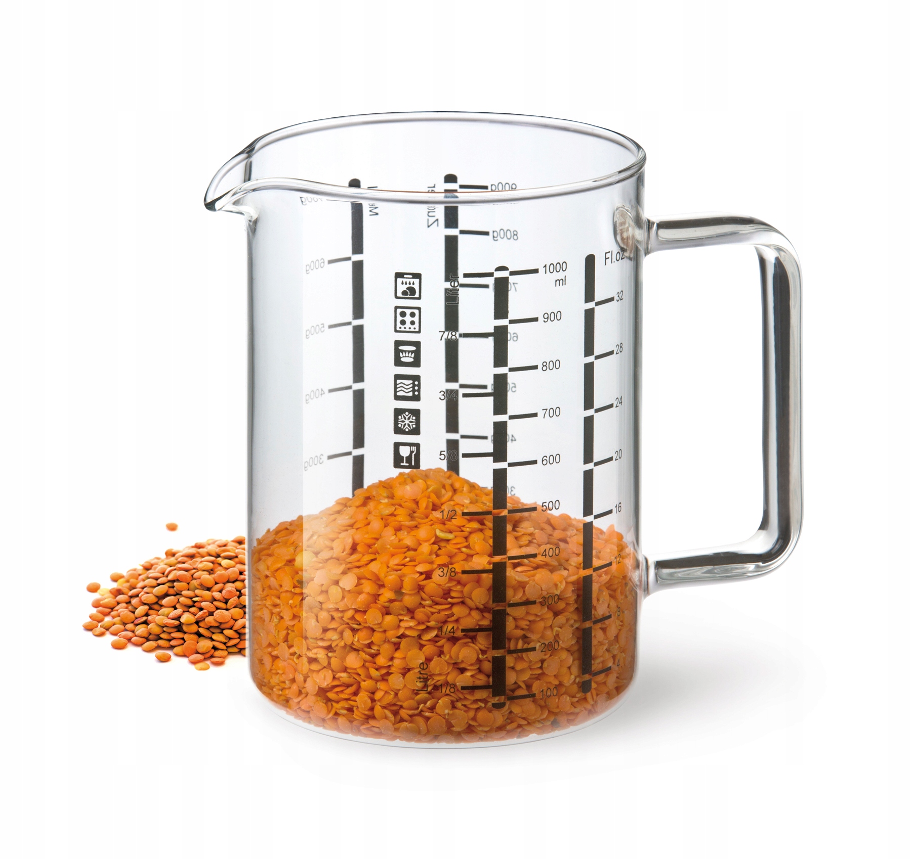 Szklana miarka kuchenna 1 litr to nieoceniona pomoc w każdej kuchni. Wyposażona w cztery wyraźne skale pomiarowe, doskonale sprawdza się przy odmierzaniu zarówno płynów, jak i produktów sypkich. Dzięki wykonaniu ze szkła żaroodpornego SIMAX, wytrzymuje ekstremalne temperatury do 300°C, co czyni ją nie tylko trwałą, ale także odporną na nagłe zmiany temperatury. Neutralna chemicznie powierzchnia gwarantuje pełne bezpieczeństwo w kontakcie z żywnością, nie zmieniając jej smaku ani zapachu. To rozwiązanie, które łączy w sobie niezawodność i nowoczesny design.
